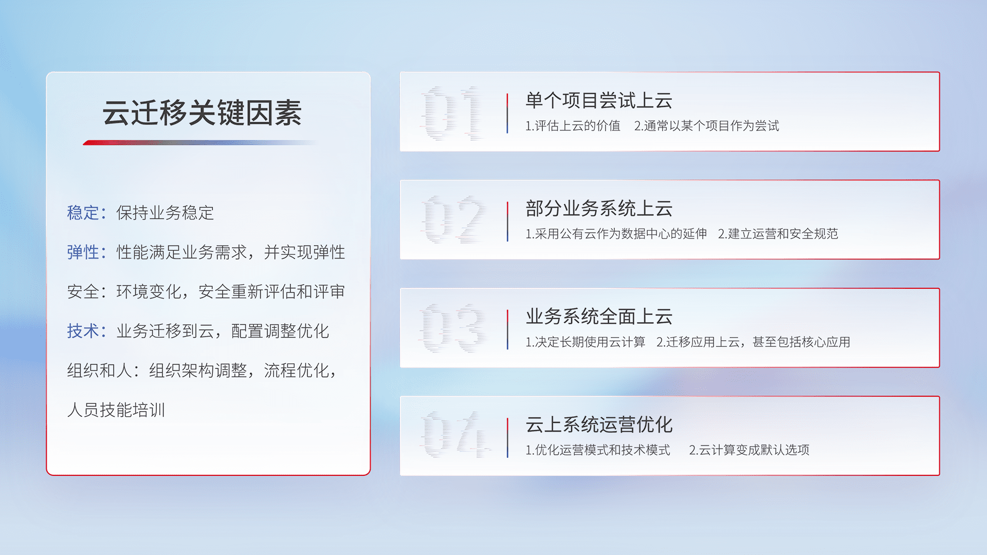 结合实际业务,,,,从规划设计、、、云平台选型、、云原生改造、、、数据迁移、、、、集成交付,,,迁移全过程为客户识别最佳上云路径,,,,做好风险识别管理,,,,设计网络架构、、、身份权限、、、安全审计合规、、、、操作审计、、、日志审计、、监控告警策略、、多站点容灾设计等,,,,对云上基础设施进行整体规划,,,,提升IT治理水平,,以满足弹性、、高可用、、、高性能的需求。。。