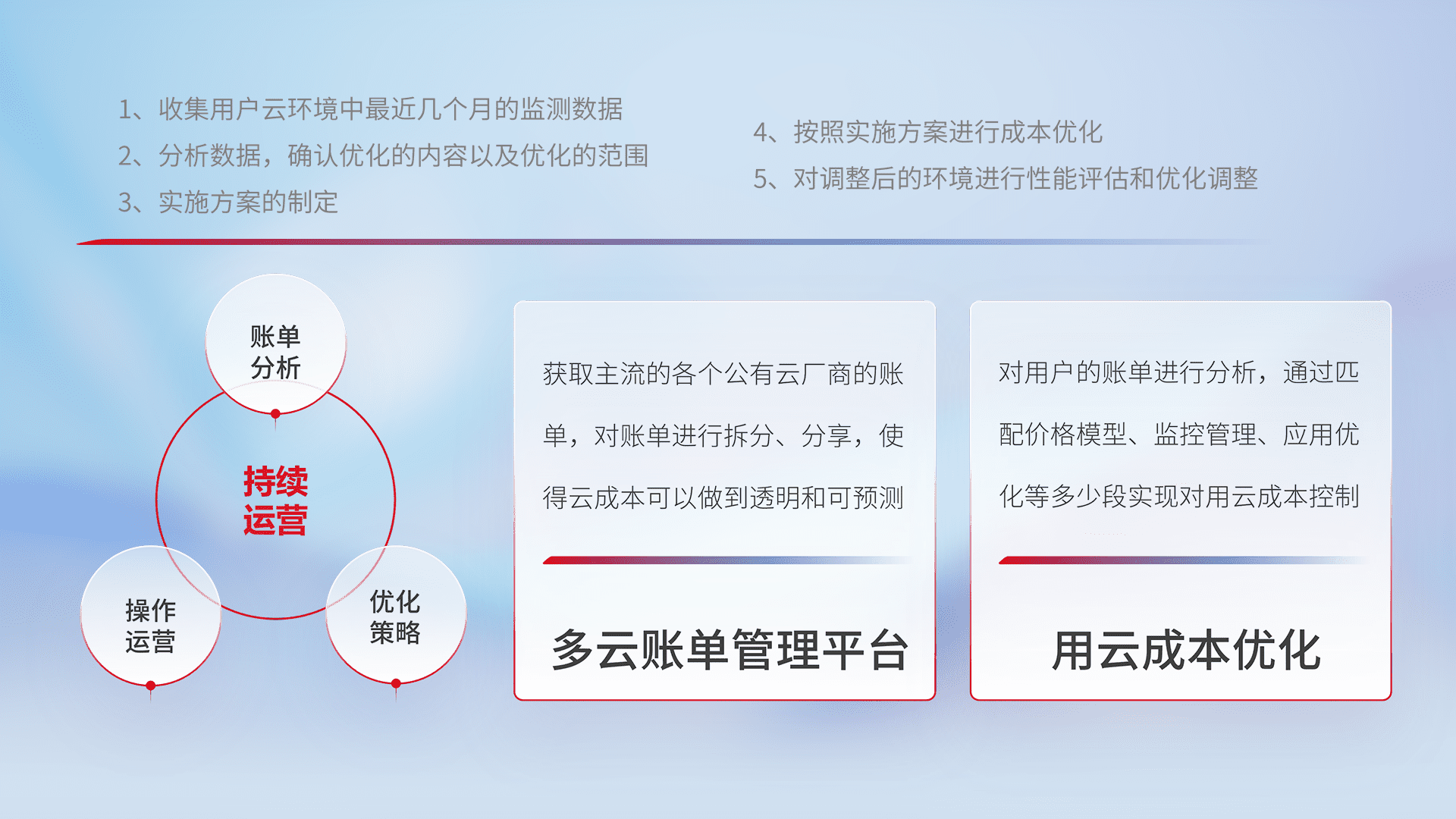 通过多云纳管,,,以统一的资源数据模型把客户的云资源进行抽象和封装,,进而实现对多云资源的统一操作,,,保障云资源管理的可靠性、、、、稳定性与可用性。。。量身定制化运维内容,,,,配置、、、开发运维、、、、补丁管理、、、、备份、、、、监控、、、认证和访问管理、、、、审计和日常巡检等,,,,保障在用云过程中的可靠度,,,稳定度以及高可用率。。。